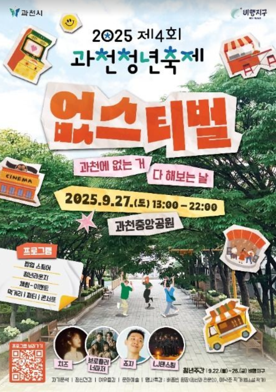 2025년 9월 27일, 과천중앙공원에서 열리는 제4회 과천청년축제 '없스티벌'에 대한 기대감이 뜨겁습니다! 조지, 브로콜리너마저 등 인기 아티스트들의 무료 공연은 절대 놓칠 수 없는 기회인데요. 과천시 청년들을 위해 마련된 이번 축제는 풍성한 공연과 다채로운 즐길 거리로 가득 채워질 예정입니다. 시원한 가을바람을 맞으며 과천청년축제에서 잊지 못할 추억을 만들어 보세요!