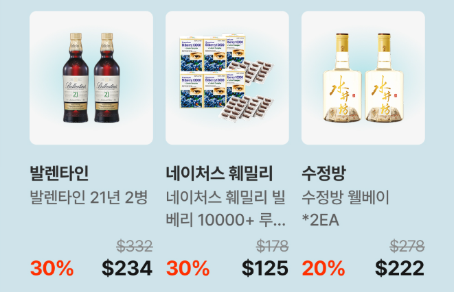 여성에게 인기 있는 에스티로더, 설화수, 조말론 등의 뷰티 제품과 남성을 위한 조니워커, 발렌타인 등의 프리미엄 주류, 정관장과 레이델 건강기능식품, 보이스캐디, 뱅앤올룹슨 전자기기 등 다채로운 선택지를 제공합니다.