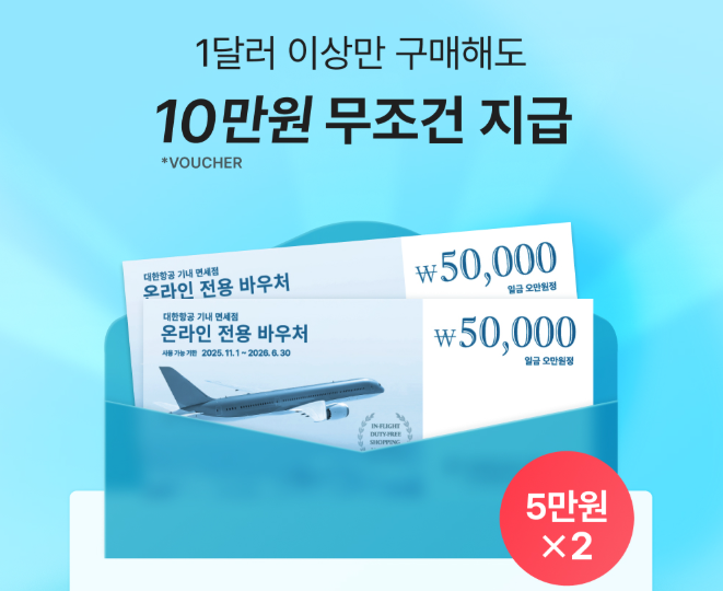 대한항공 스카이샵 블랙프라이데이 바우처는 1달러 이상 구매 시 기내에서 10만원 상당의 바우처 2매로 제공됩니다. 온라인몰에서 쿠폰 번호 등록 후, 주문 건당 200달러 이상 구매 시 바우처 1장을 사용할 수 있습니다. 바우처는 중복 사용이 불가능하며, 각각 다른 주문 건에 적용해야 합니다.