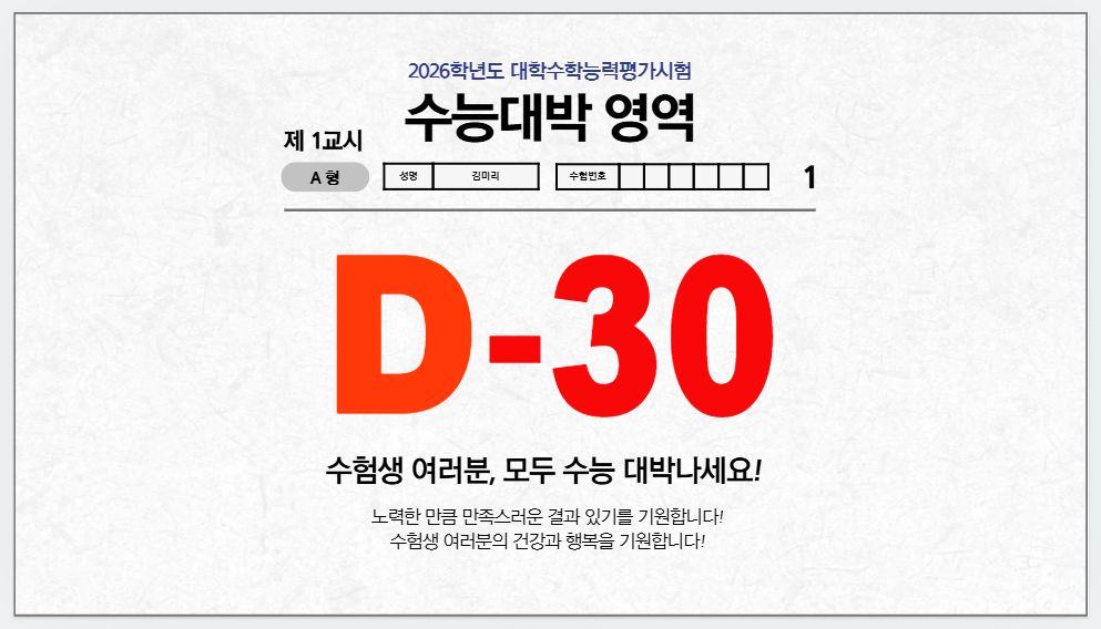 2026 수능까지 단 30일. 지금부터는 ‘잘하는 걸 유지하고, 부족한 건 줄이는’ 전략이 필요합니다. 지나치게 새로운 걸 시도하기보다, 내 것이 된 내용을 단단히 다져야 합니다. 여러분은 이미 충분히 잘해왔고, 지금까지의 모든 준비가 여러분의 무기가 될 것입니다. 이 글이 수능 전 마지막 정리를 돕는 가이드가 되길 바랍니다. 마지막까지 흔들림 없는 집중력과 평정심을 갖고 자신 있게 시험장에 들어가세요. 여러분의 꿈, 충분히 현실이 될 수 있습니다!