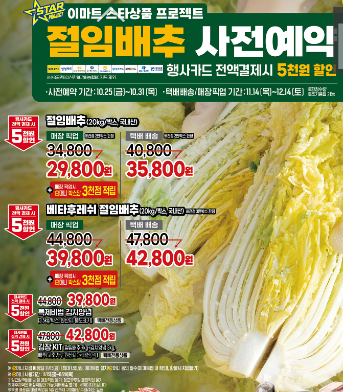 | 홈플러스 | 10월 10일부터 | 절임배추(해남, 괴산) | 산지 다변화, 선착순 한정 할인 |